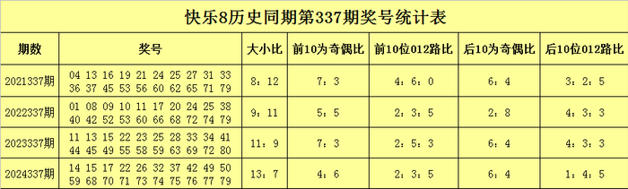 从上表可以看出,在第337期历史同期开奖中,前10为号码奇偶比为23:17,奇数号码开出频次较高,去年同期前10位偶数号码走势较热,出现了1个偶号,今年同期看好前10位偶数号码连续热出,参考号码06、07、12、13、14、16、17、27、30、32。
