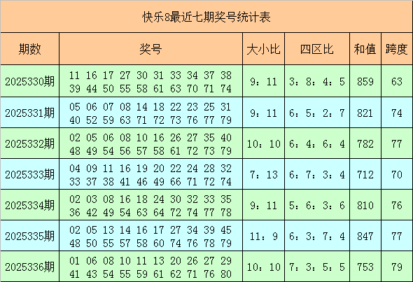 福彩快乐8第2025336期开出奖号:01 06 08 10 11 13 20 26 27 29 41 43 54 55 59 61 62 71 76 80,其中奖号大小比为10:10,四区比为7:3:5:5,和值为753,跨度为79。