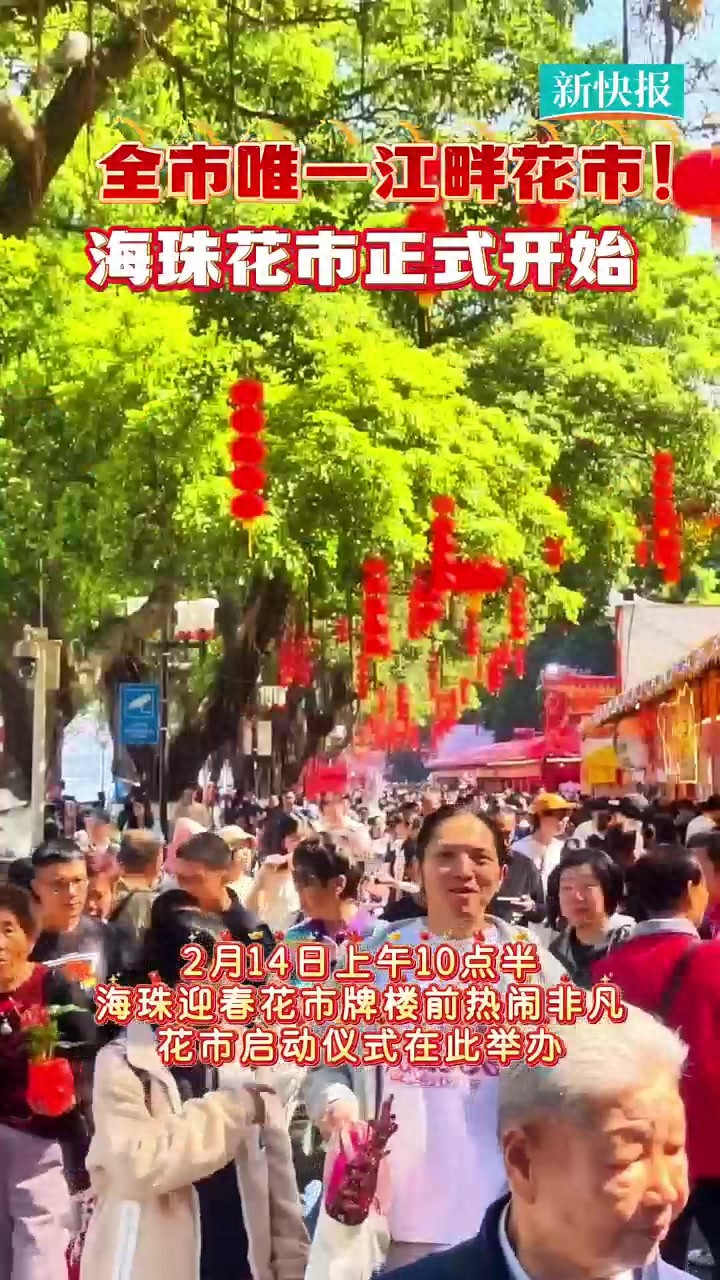 海珠滨江花市是全市唯一的江畔花市 。2026年海珠滨江花市于2月14日上午8点30分至17日凌晨2点(为期3天)举办,今年花市既保留千年花洲的文化底蕴,又融入科技互动元素,将为市民呈现一场兼具年味与新意的迎春盛会。